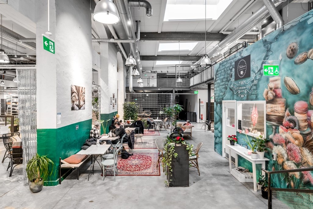 Vid renovering och modernisering av hallen har så mycket som möjligt av den industriella miljön bevarats. Det som sätter prägel är de rustika väggarna av vitmålat tegel, betonggolvet, traversen i taket och detaljer i glas och metall. Takhöjden är magnifik och förutom stora butiksglas ut mot gatan får hallens entresolplan sitt ljus från takfönster.
